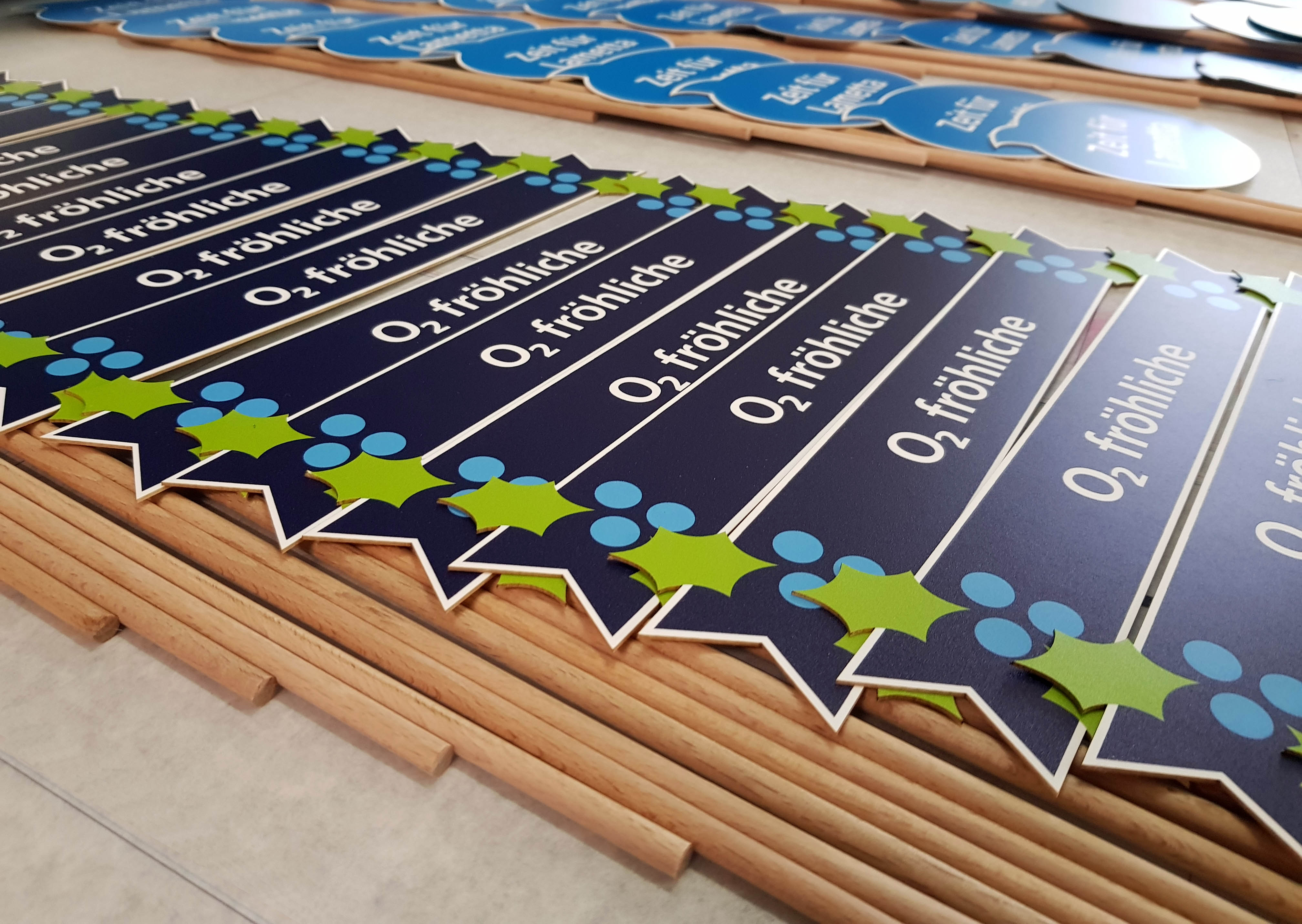 UV bedruckte Pappe, lasergeschnitten und mit Holzstiel versehen